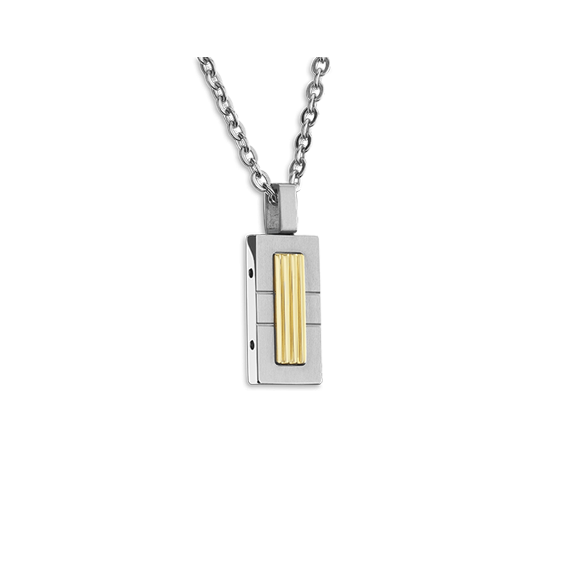 Soyez unique avec ce pendentif Empreinte en acier bicolore PVD Jaune signée ROCHET! Son motif central en godron ciselé révèlera votre virilité et votre élégance. A porter sans modération: en soirée, au travail ou en mode plus décontracté sous une chemise retroussée.