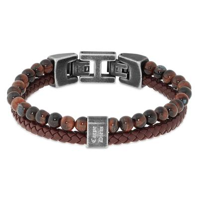 Bracelet KARMA en acier vintage, cuir tressé bordeaux et perles œil de taureau 21,5cm. Réglable
