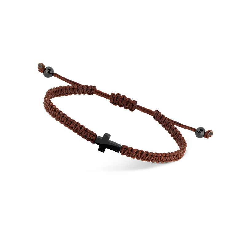 Bracelet MYSTERES shamballa marron et croix en acier PVD noir