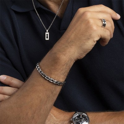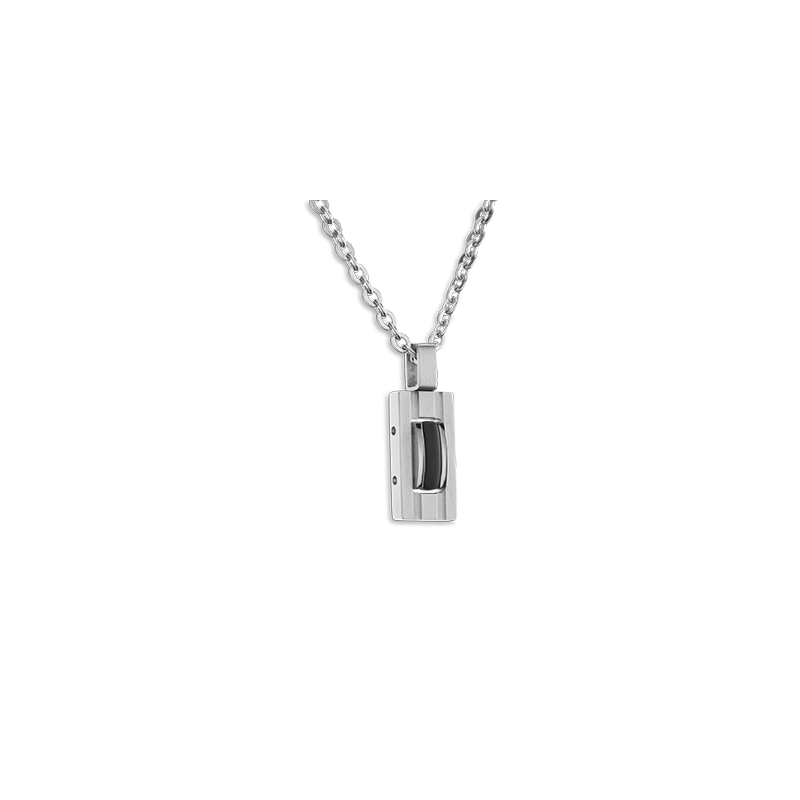 Une grande originalité pour le pendentif, de la gamme Tech de ROCHET! L'alliance de l'acier satiné, aux inserts en silicone noir enrichit ce pendentif d'un raffinement moderne et technique.