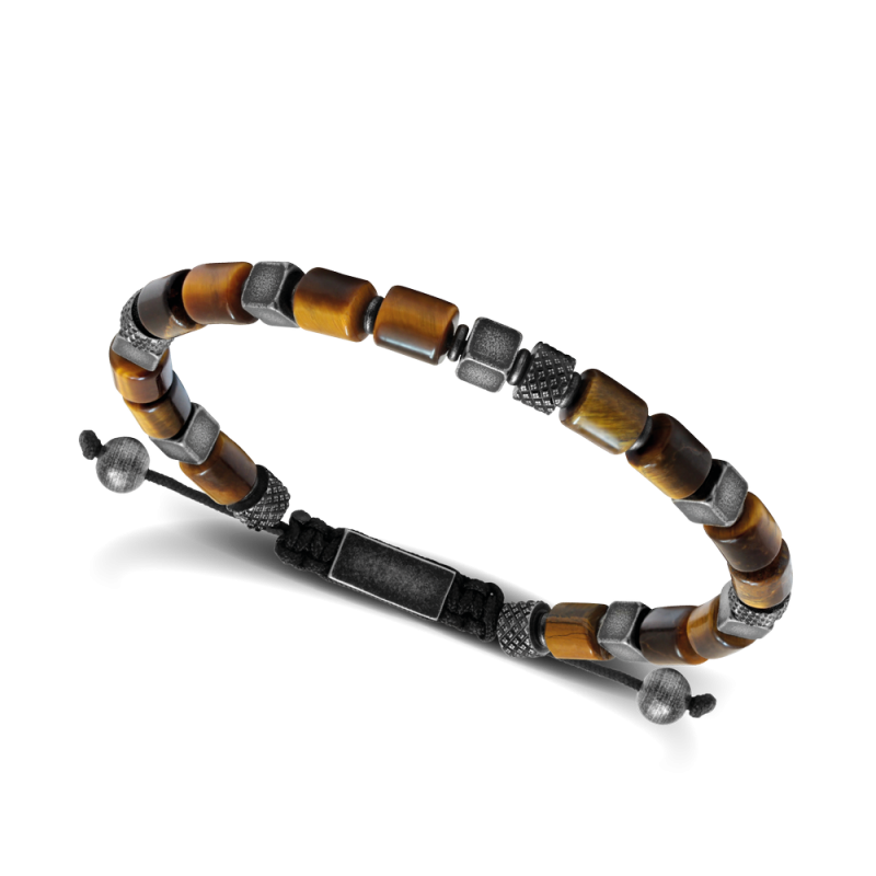 Bracelet NIRVANA perles 6mm en acier vintage et œil de tigre sur cordon polyester. Réglable