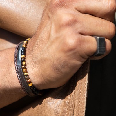 Quand le confort rencontre le style. Le cuir tressé et plat, associé à la douceur des pierres naturelles œil de tigre et à la robustesse de l'acier, crée un bracelet à la fois élégant et décontracté. Le double fermoir réglable assure un ajustement optimal.